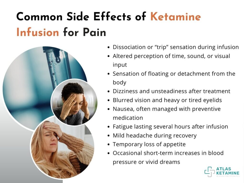 The temporary nature of these side effects is balanced against the therapy’s goal of sustained analgesia. Proper clinical management ensures both patient safety and treatment efficacy throughout the process. Below are the common side effects of ketamine infusion for pain.