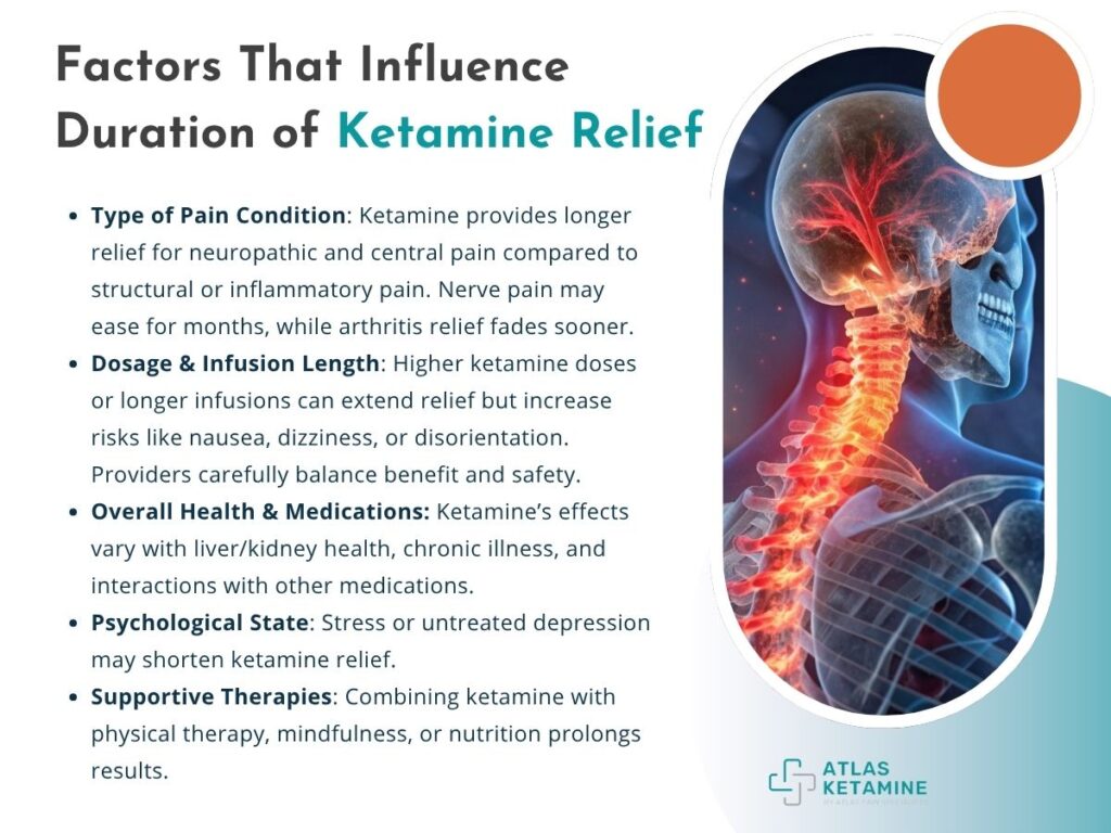 Not everyone experiences the same timeline of pain relief. Several key factors influence how long ketamine’s effects last.The duration of relief depends on the type of pain condition, individual biology, overall health, and whether maintenance care is followed.