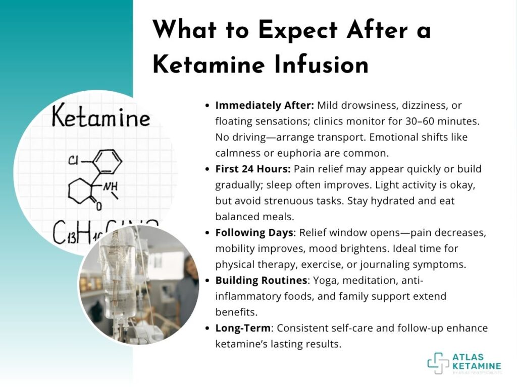 When the infusion ends, most people feel a little disoriented or drowsy. Some describe sensations like floating, mild dizziness, or changes in vision. These usually fade within an hour, but clinics typically monitor patients for at least 30 to 60 minutes before sending them home. Driving is not allowed afterward, so arranging transportation is necessary.